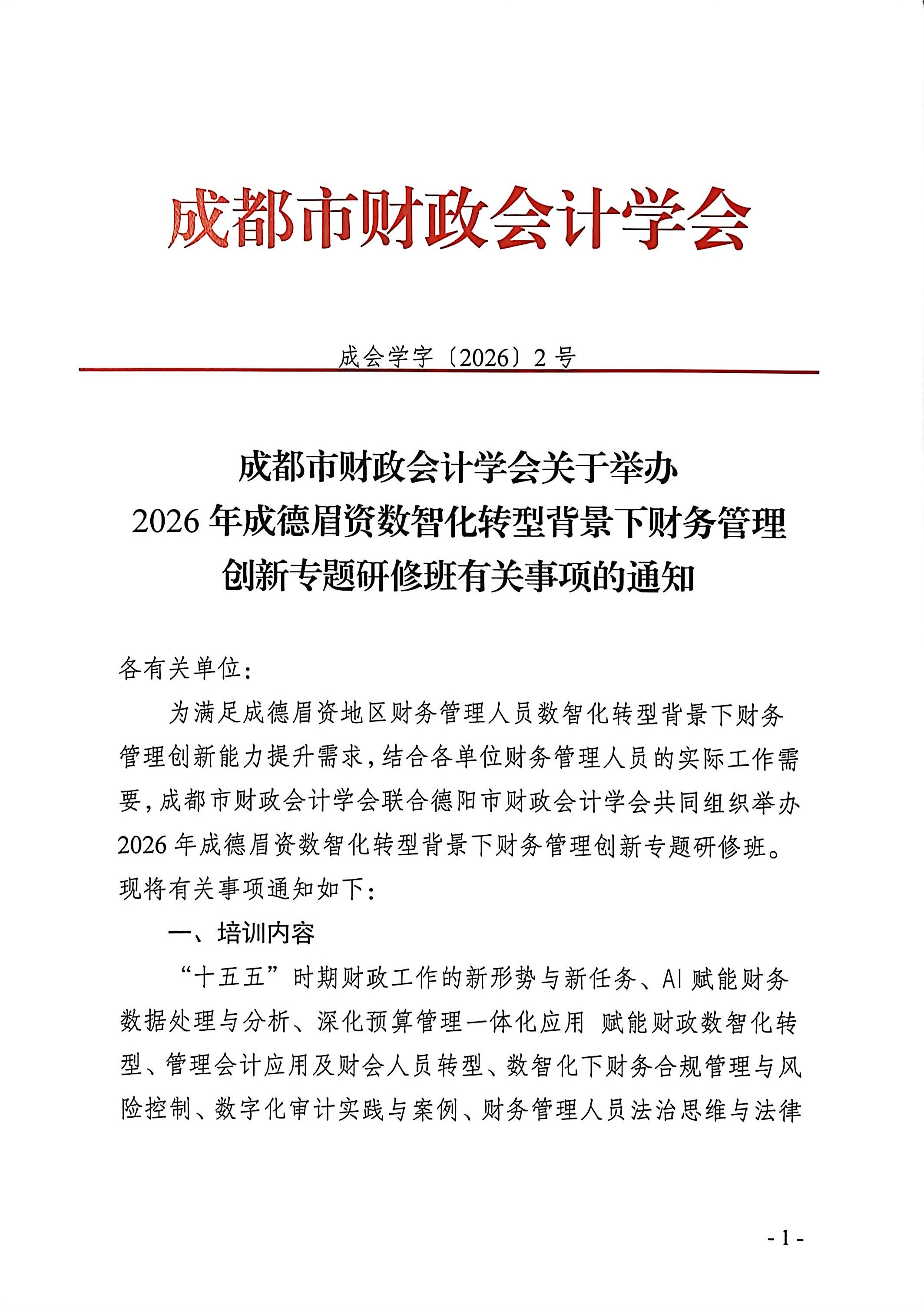 成都市财政会计学会关于举办2026年成德眉资数智化转型背景下财务管理创新专题研修班有关事项的通知.pdf